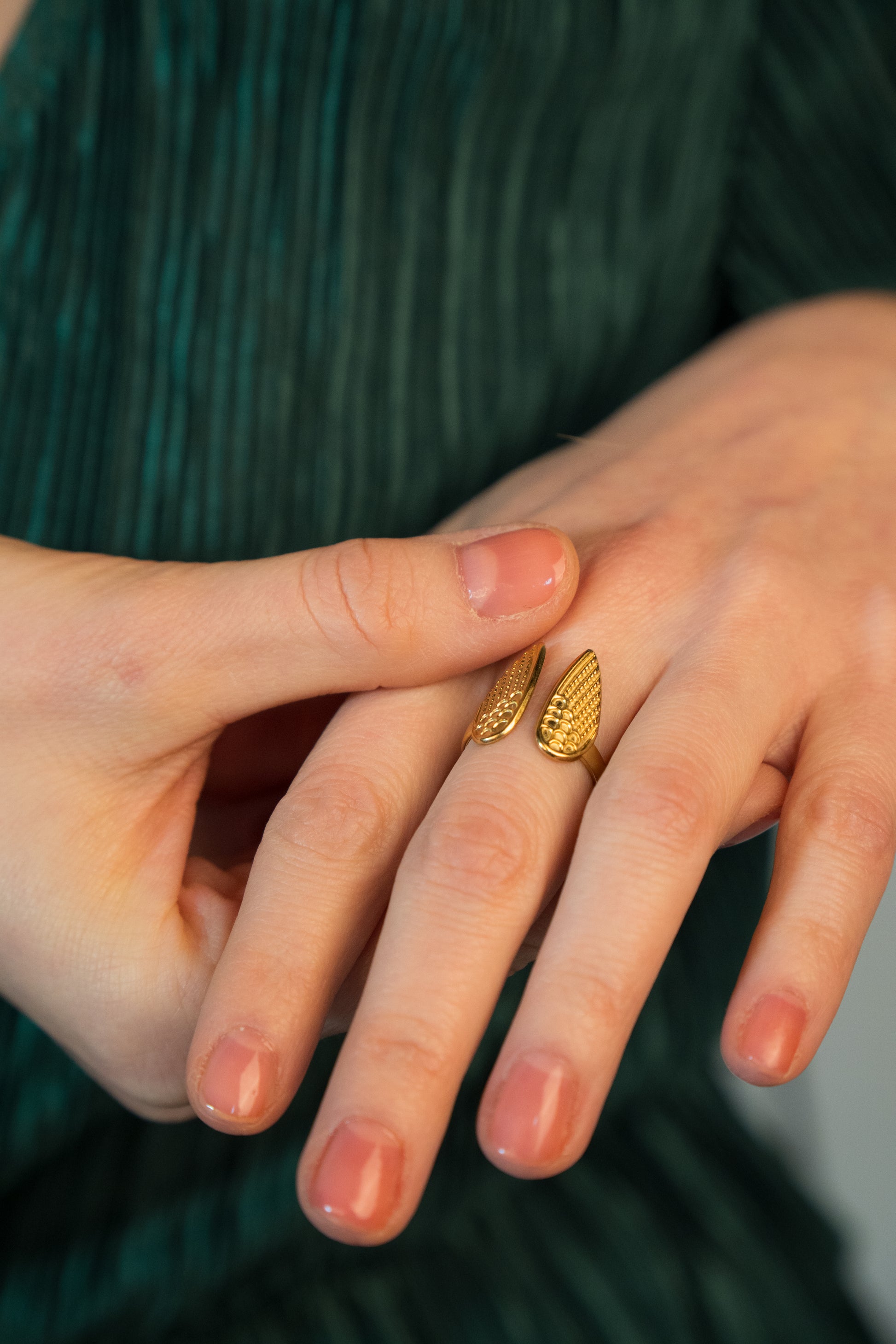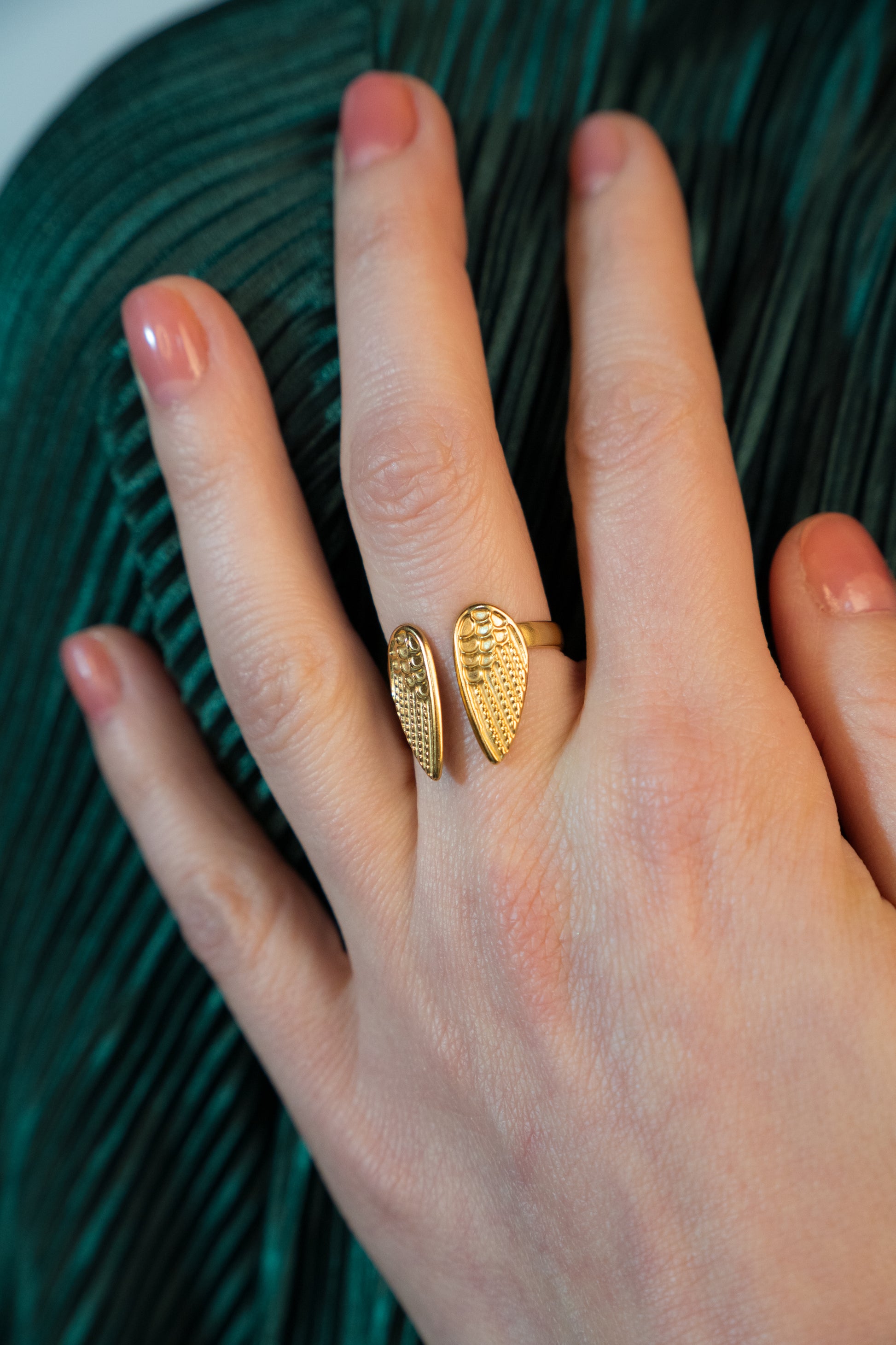 Un inel delicat și simbolic, creat pentru femeile care poartă cu ele un strop de lumină. Designul în formă de aripi fine, texturate, sugerează protecție, libertate și eleganță - un mic reminder că ai mereu forța de a te ridica, indiferent de situație.