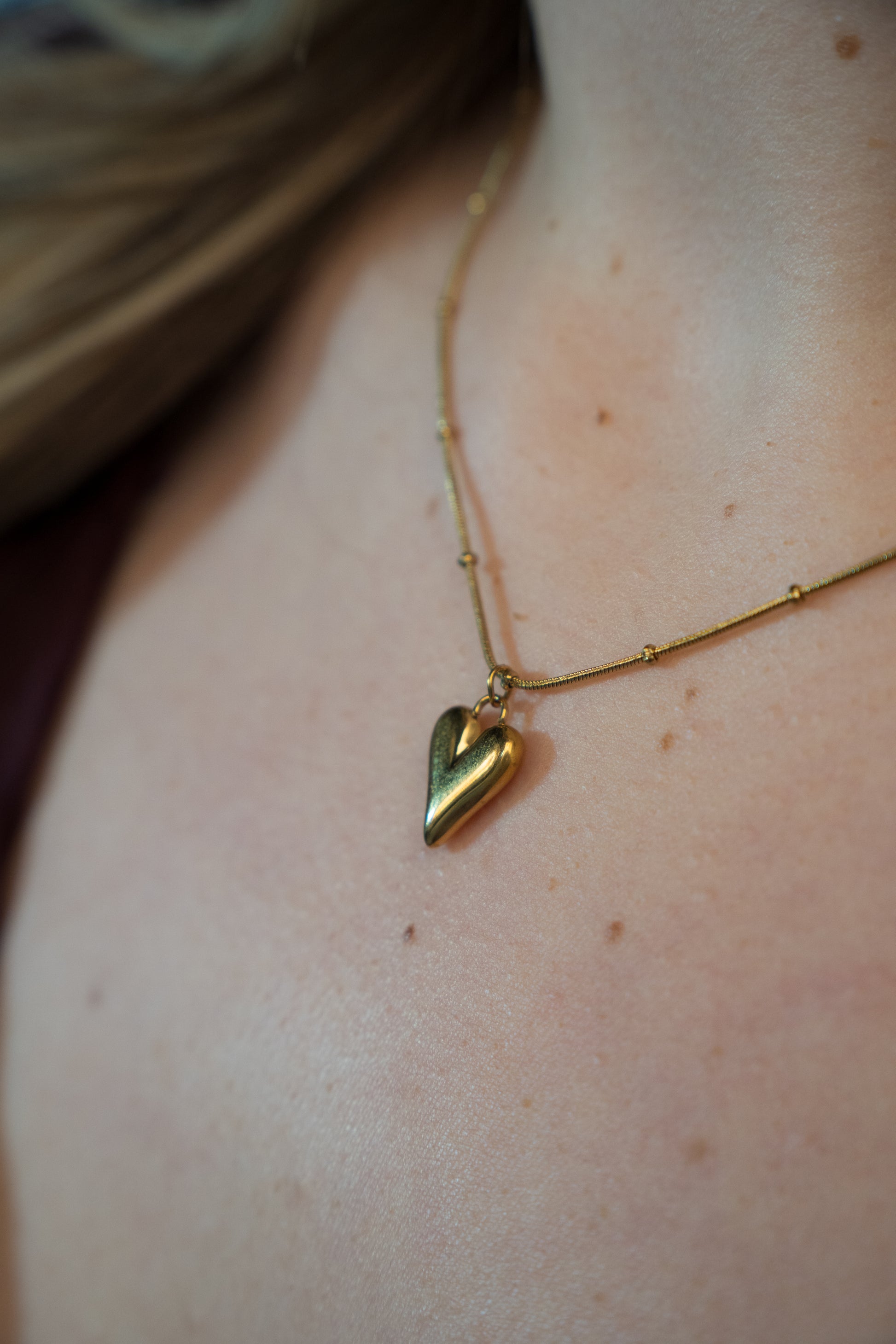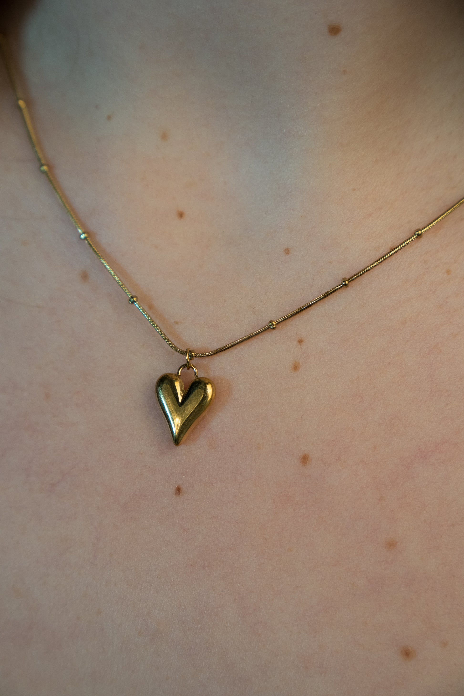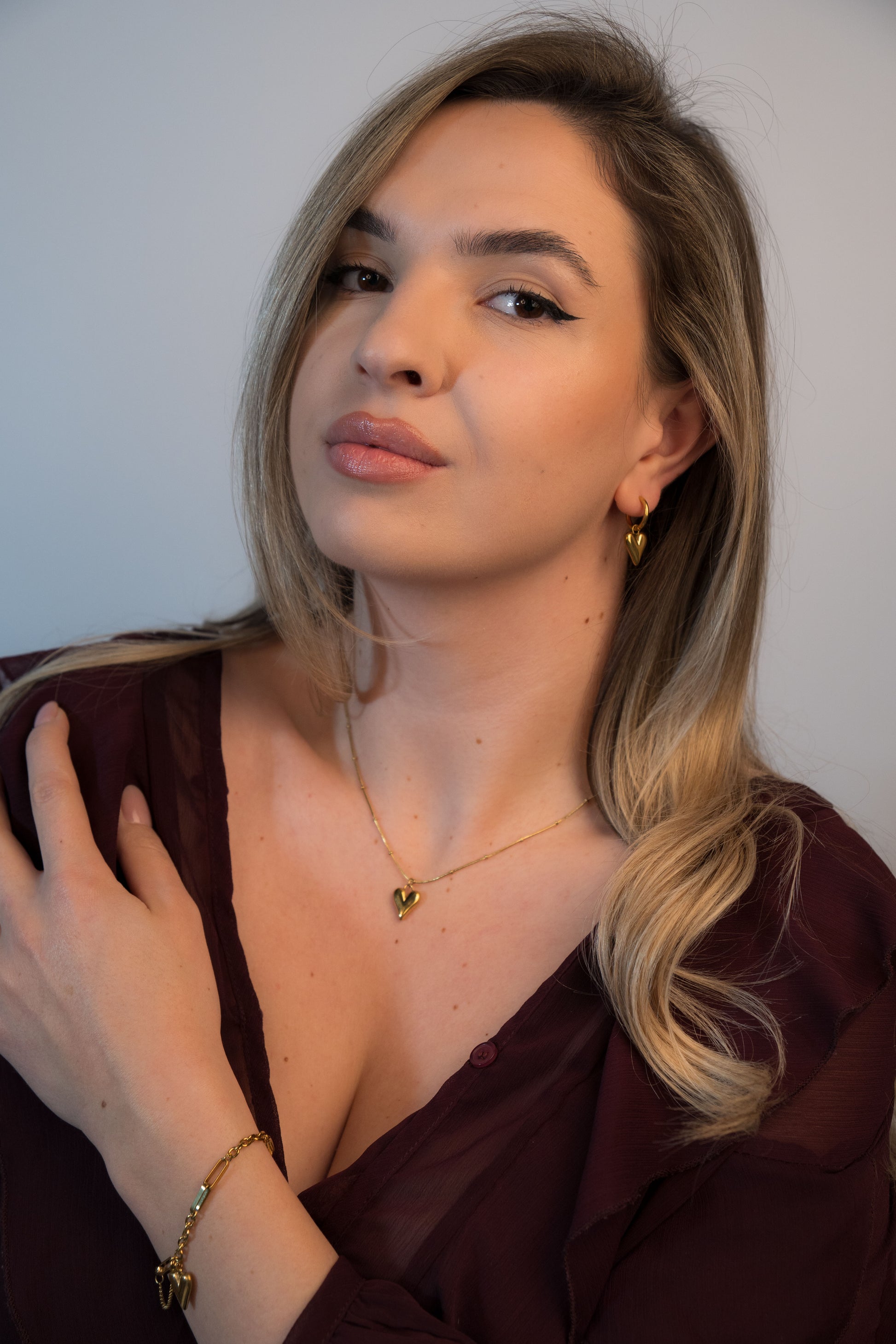 O declarație de iubire purtată la gât. „Certified Heartbreaker” este un colier sculptural și extrem de feminin, cu un pandantiv în formă de inimă alungită, lucios și voluminos, care atrage privirile instant. Designul modern, fluid, și lanțul tip snake fac din această piesă un accesoriu statement, ideal pentru ținute elegante sau glam.