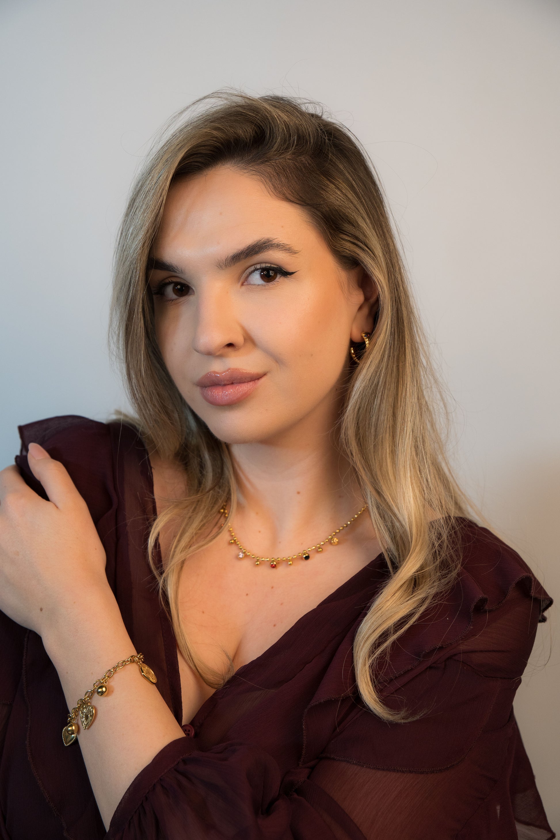 O brățară statement, bogată vizual și plină de detalii atent lucrate. „Golden Charms Hearts Bracelet” combină talismane aurii în forme simbolice: inimă, medalion cu trandafir, charm rotund - toate placate cu aur de 18K pentru un luciu intens și elegant.