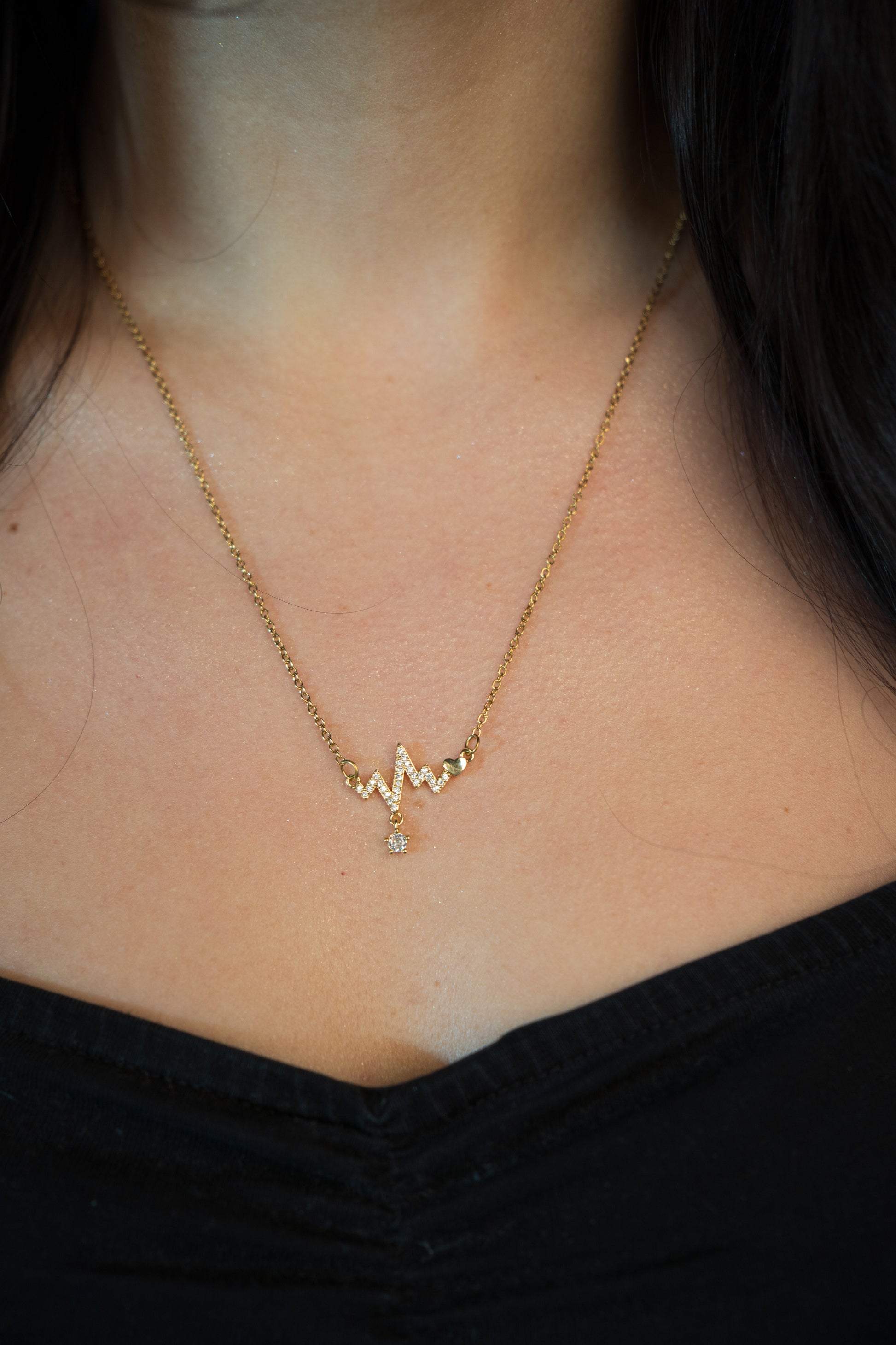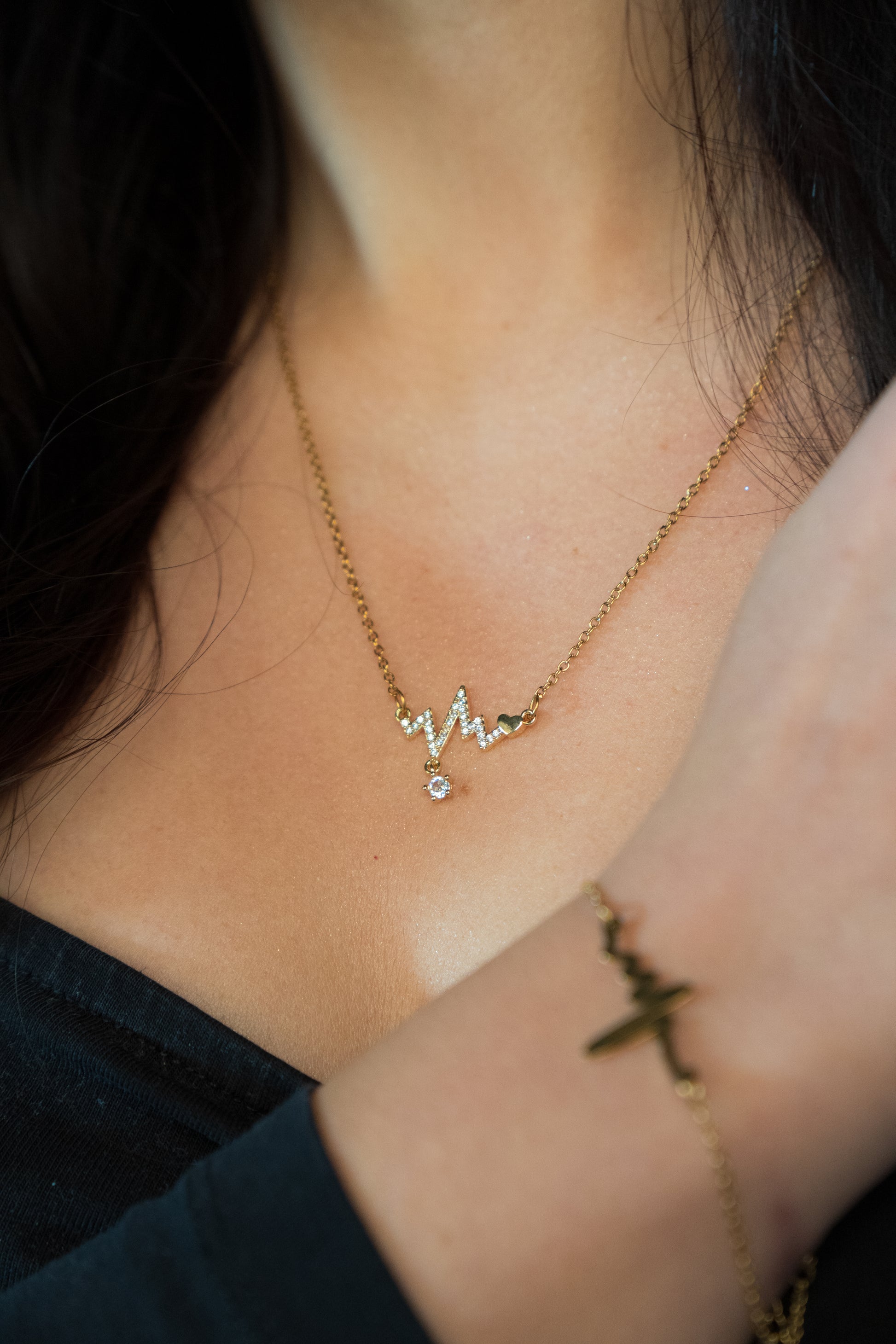 Un colier care spune o poveste: ritmul inimii tale, surprins într-o bijuterie strălucitoare. „Heart on Hold” combină un simbol modern al pulsului cu o mică inimioară, iar în partea de jos un cristal cubic zirconia adaugă o notă de glam subtil.