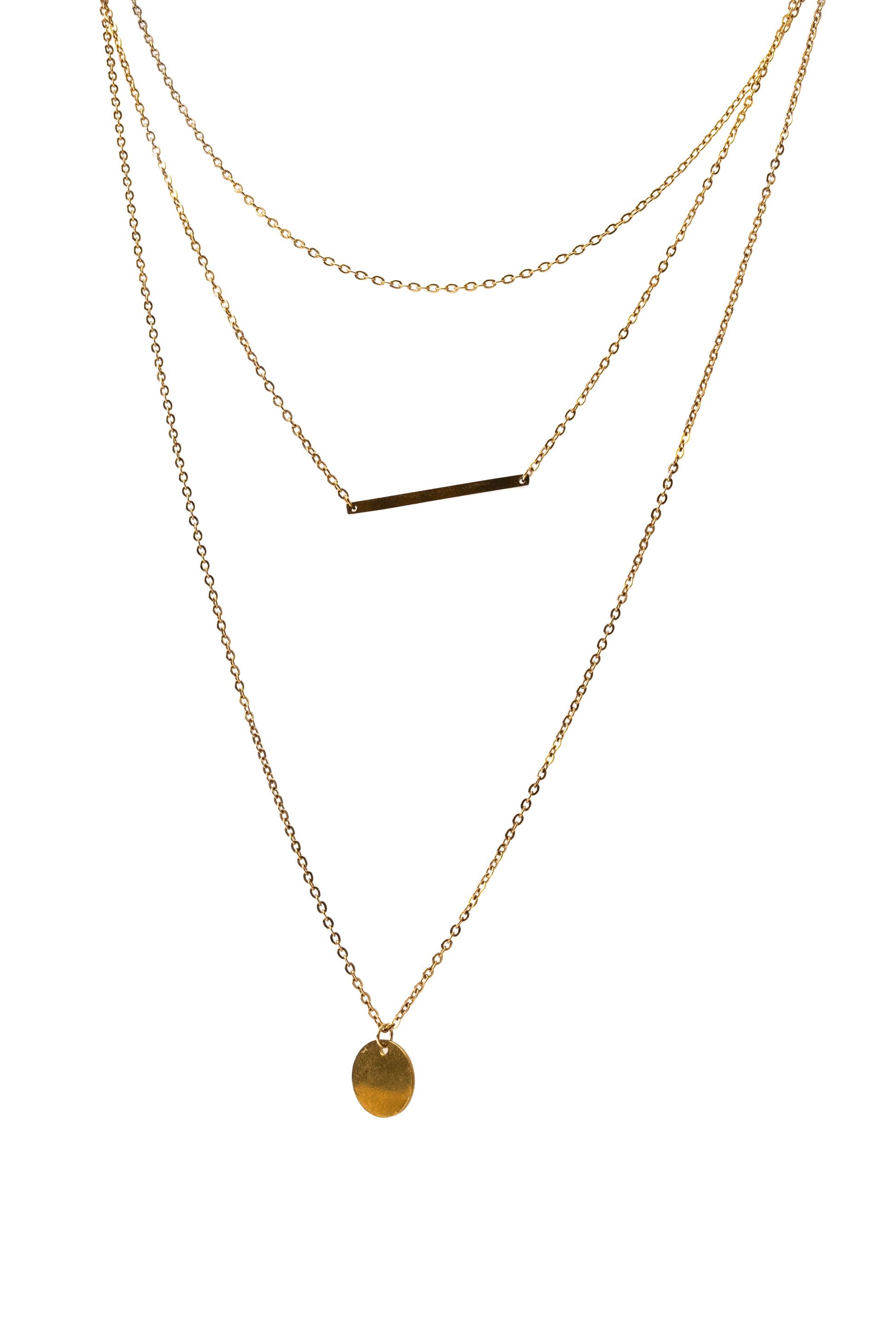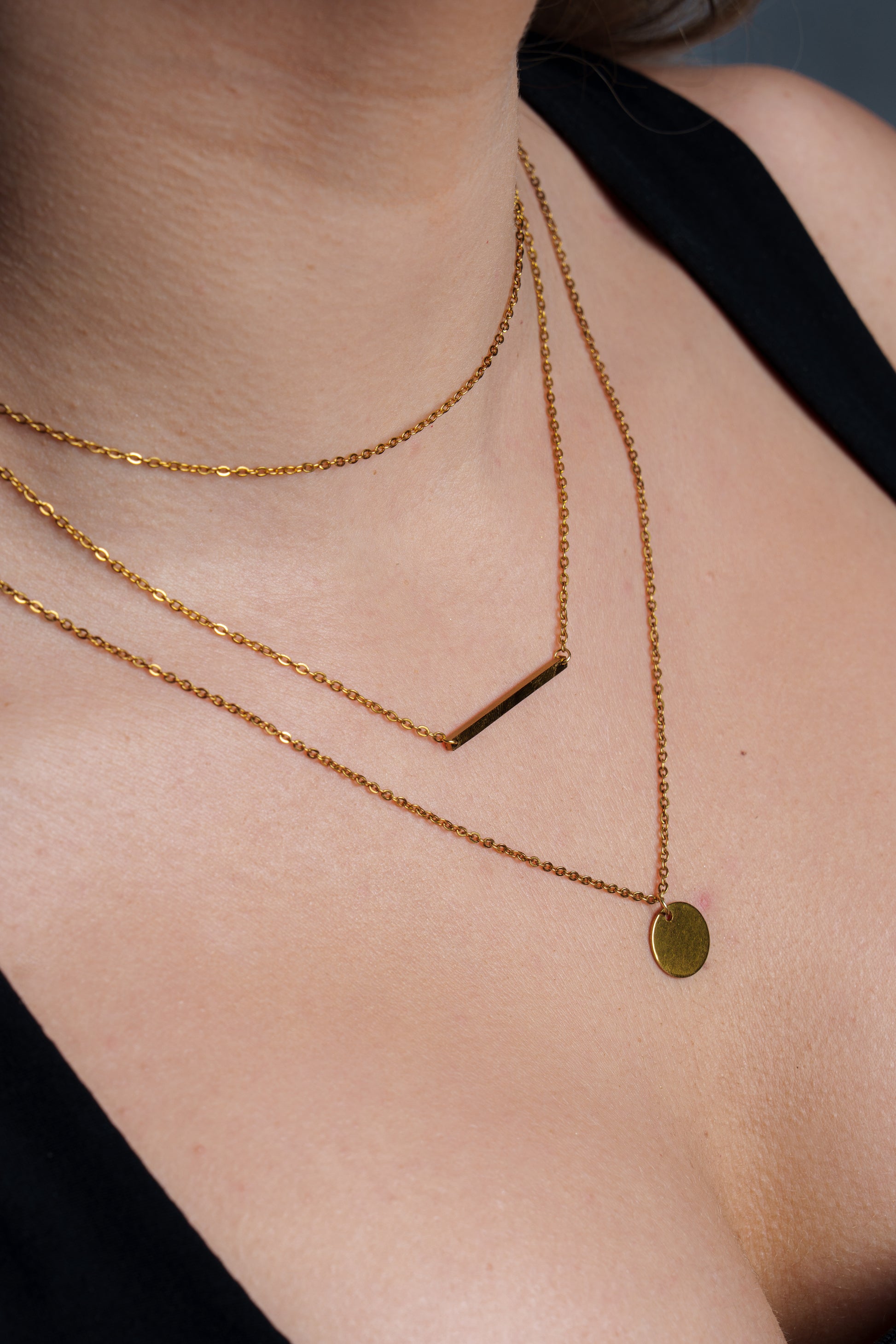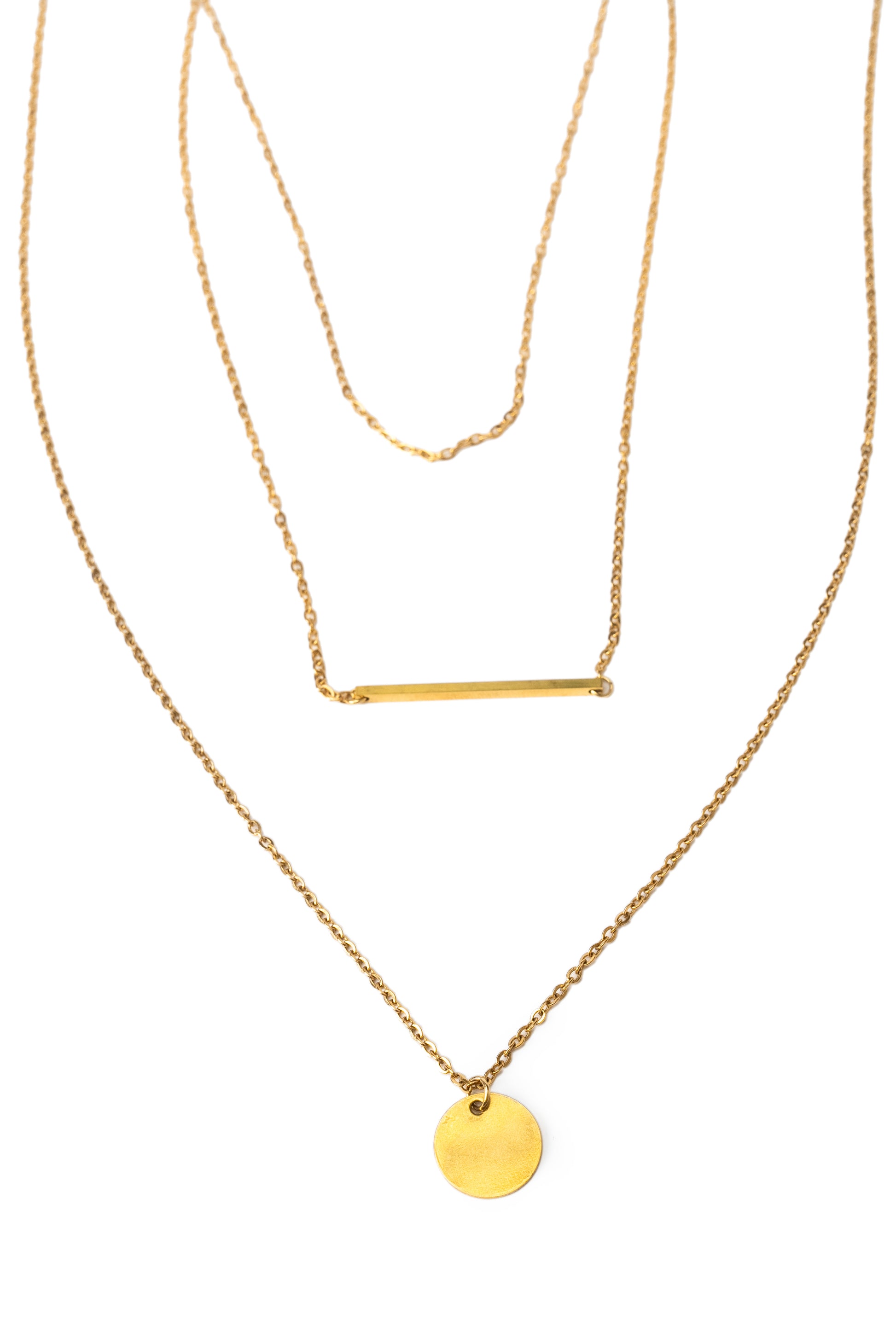 Colier stratificat placat cu aur de 18K, cu un mix de forme geometrice și pandantive minimaliste.