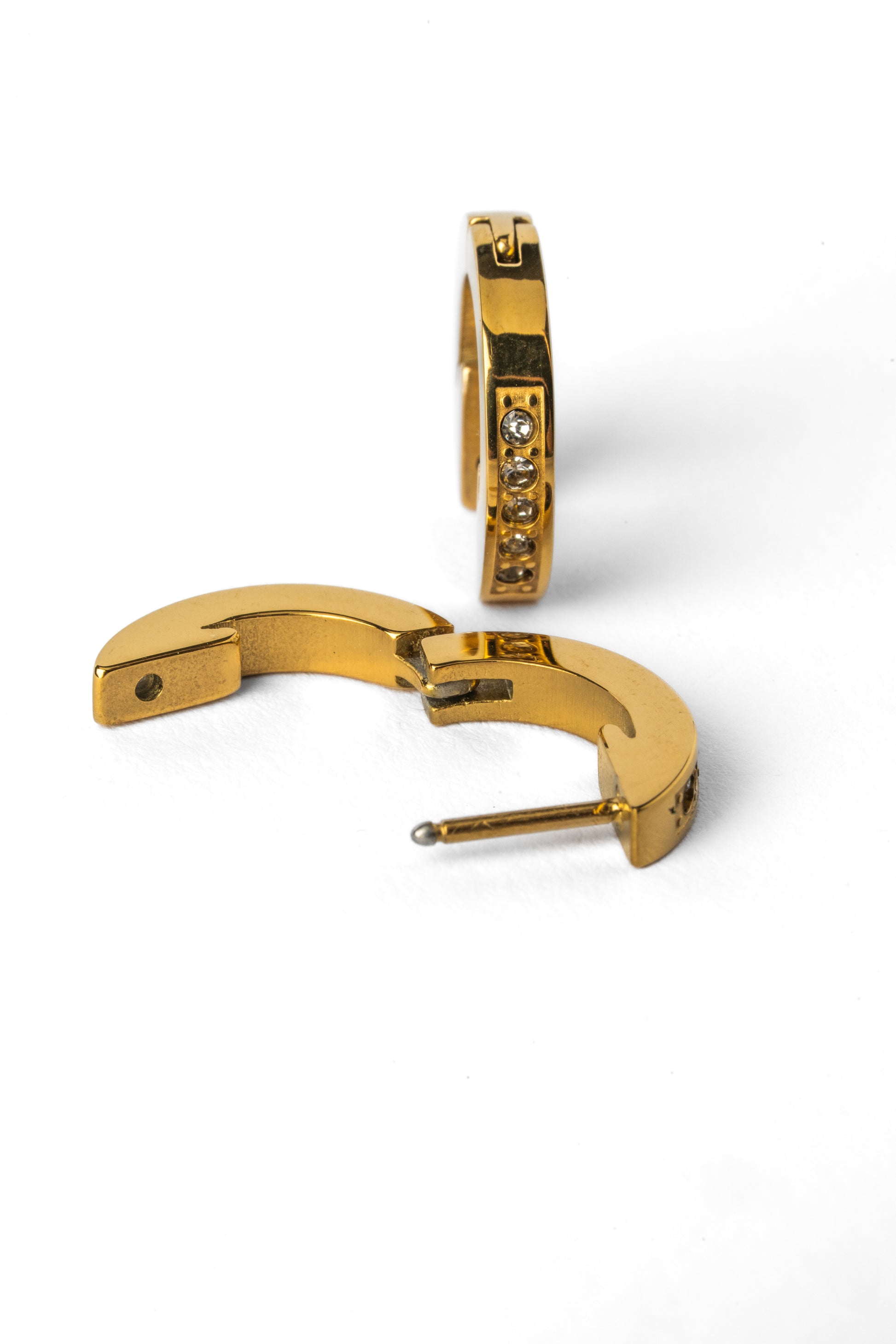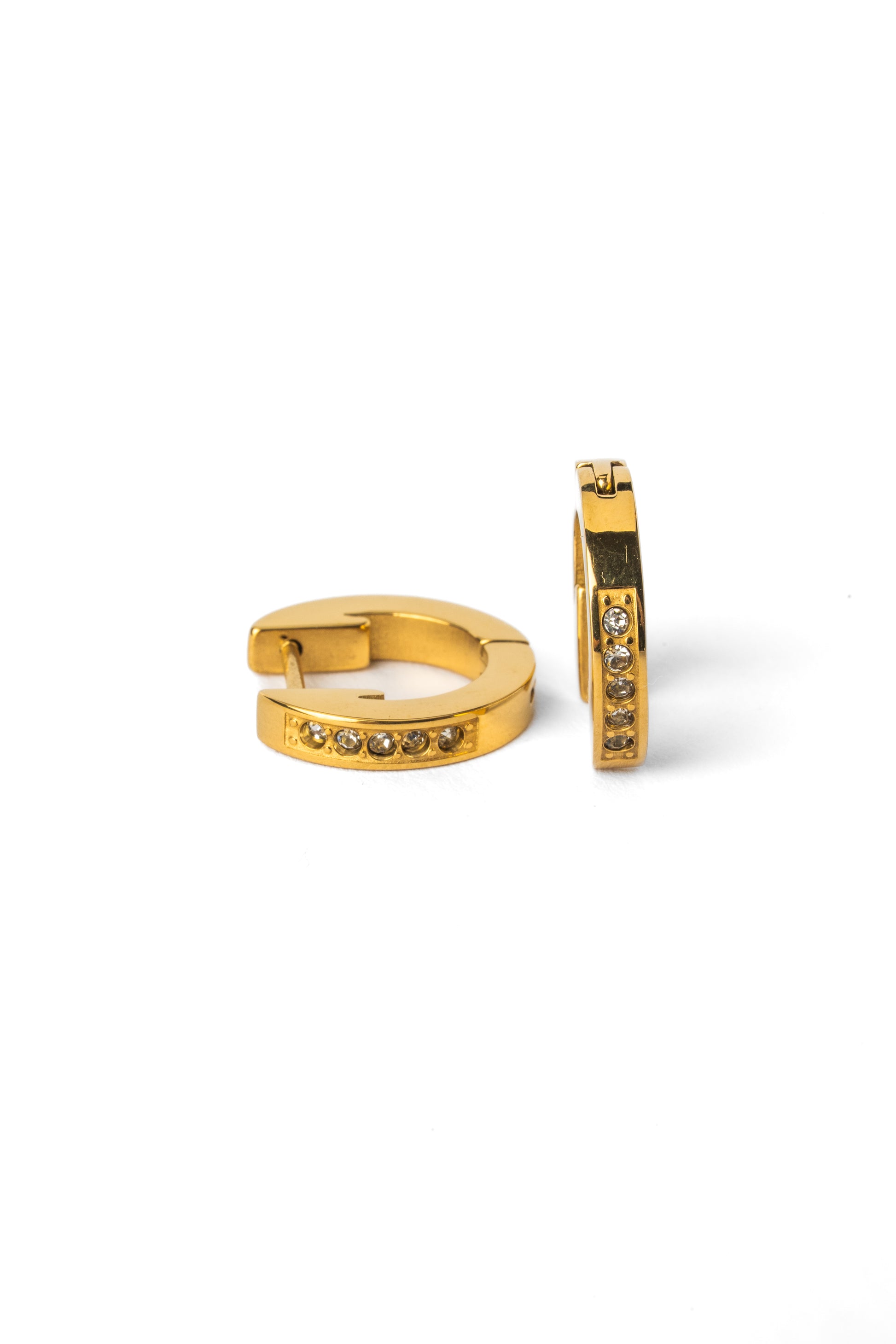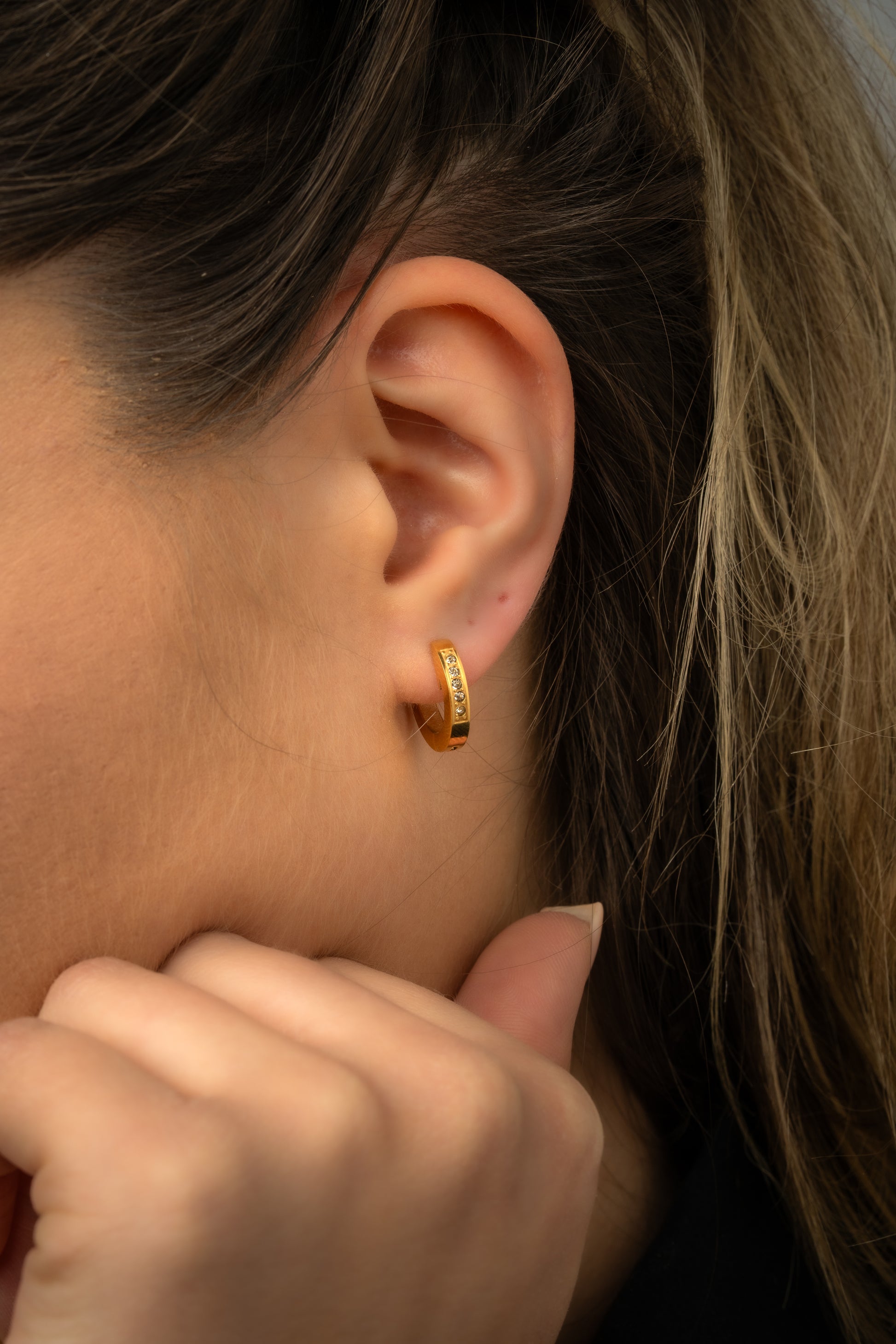 Cercei huggie placați cu aur de 18K cu șir de cristale pavé în față și prindere sigură.
