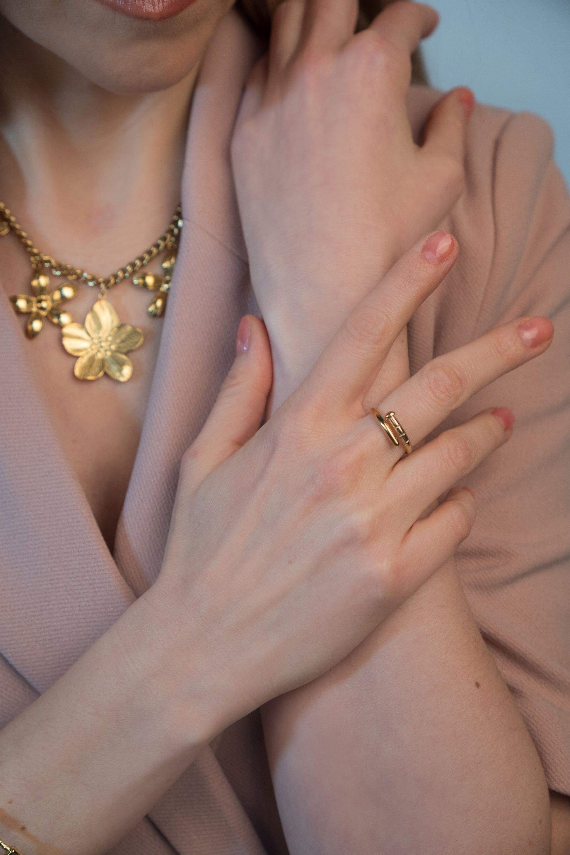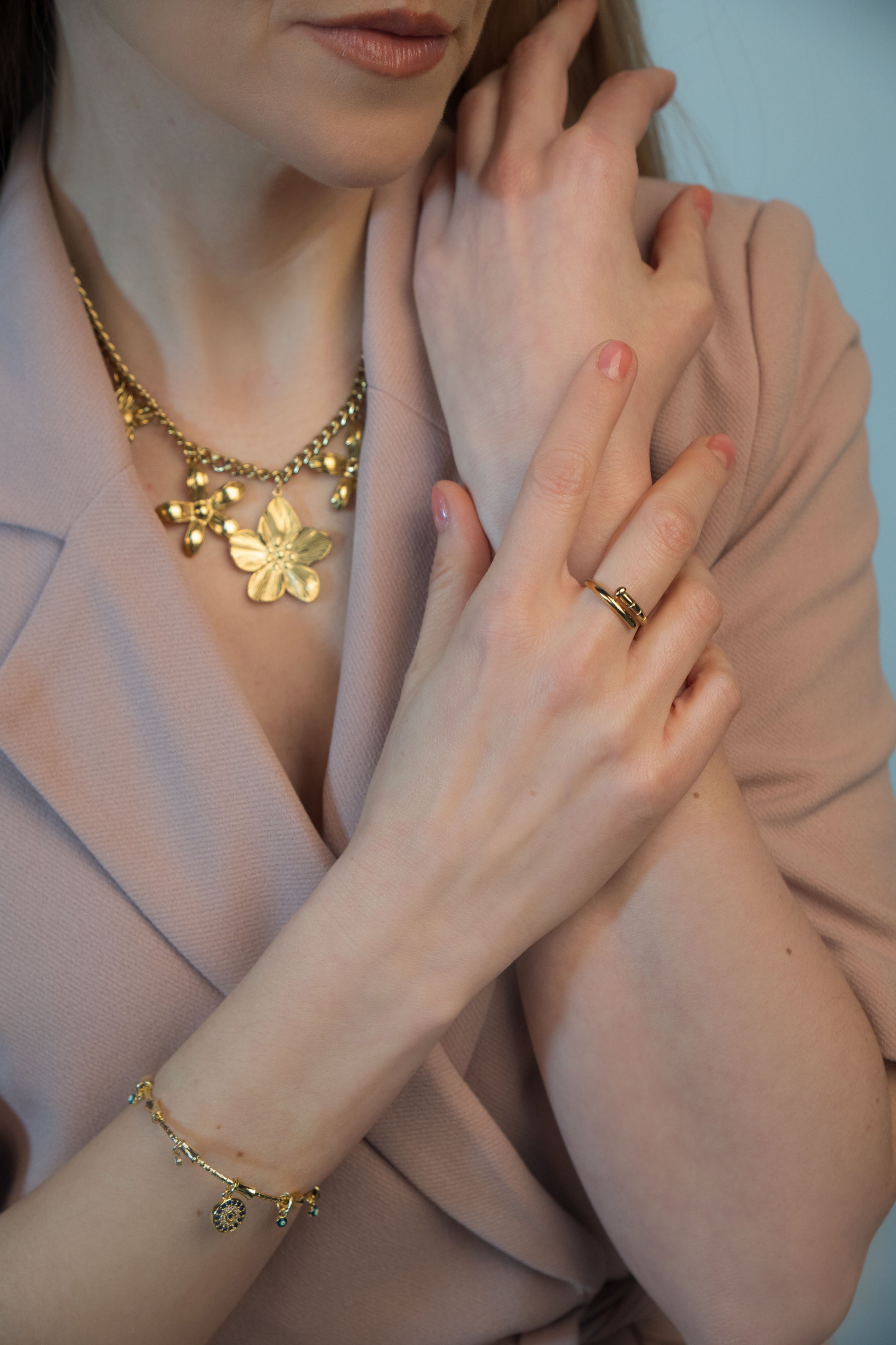 „Pretty Dangerous” este o piesă statement, creată pentru femeia care iubește bijuteriile cu personalitate și prezență. Cele cinci flori aurii, sculptate în detaliu, dau un efect luxuriant și feminin, perfect pentru ținute îndrăznețe, elegante sau de vacanță.