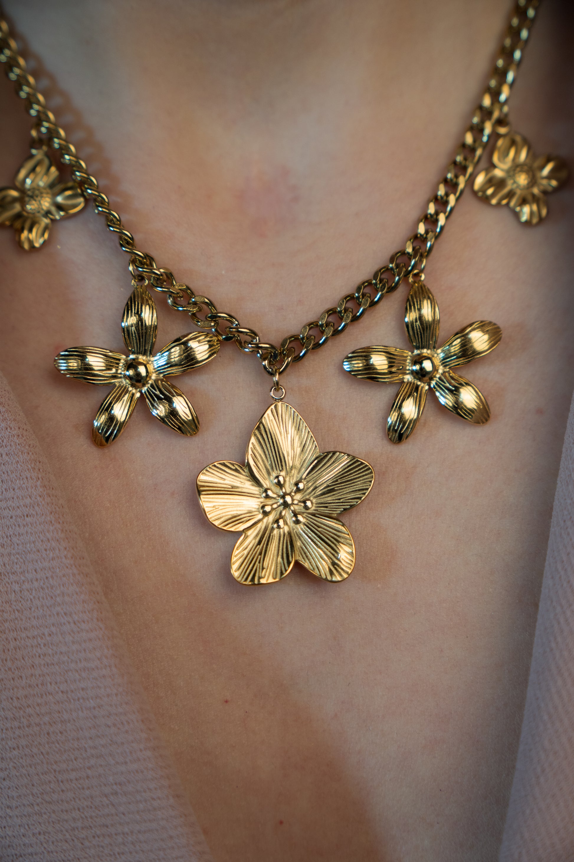 Placarea cu aur de 18K și lanțul gros creează un contrast superb între delicatețea florilor și stilul glam al colierului. Este o bijuterie care captează priviri și pune în valoare orice decolteu.