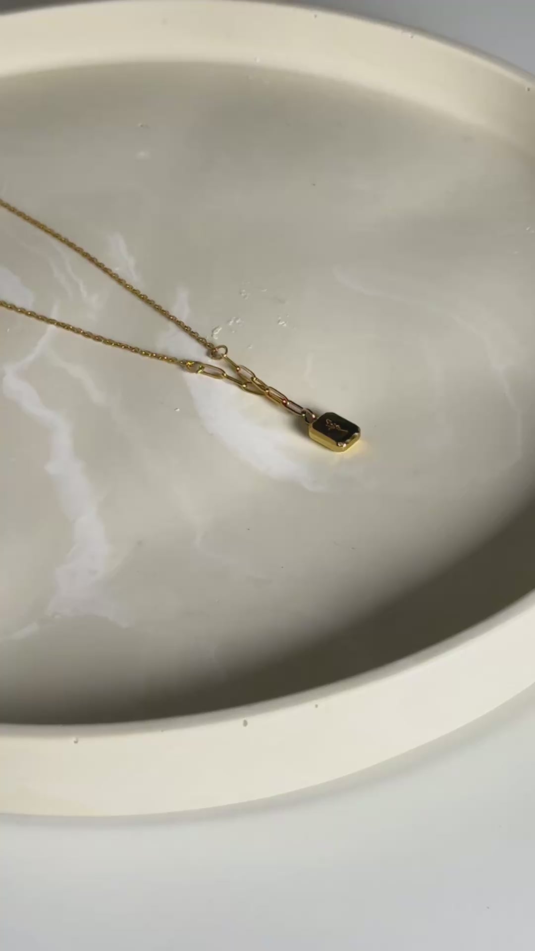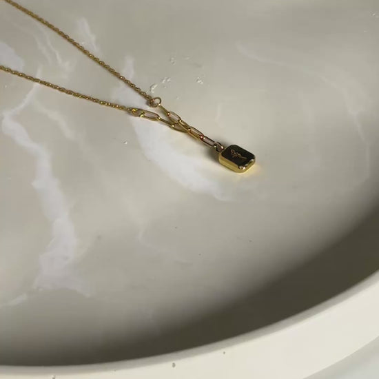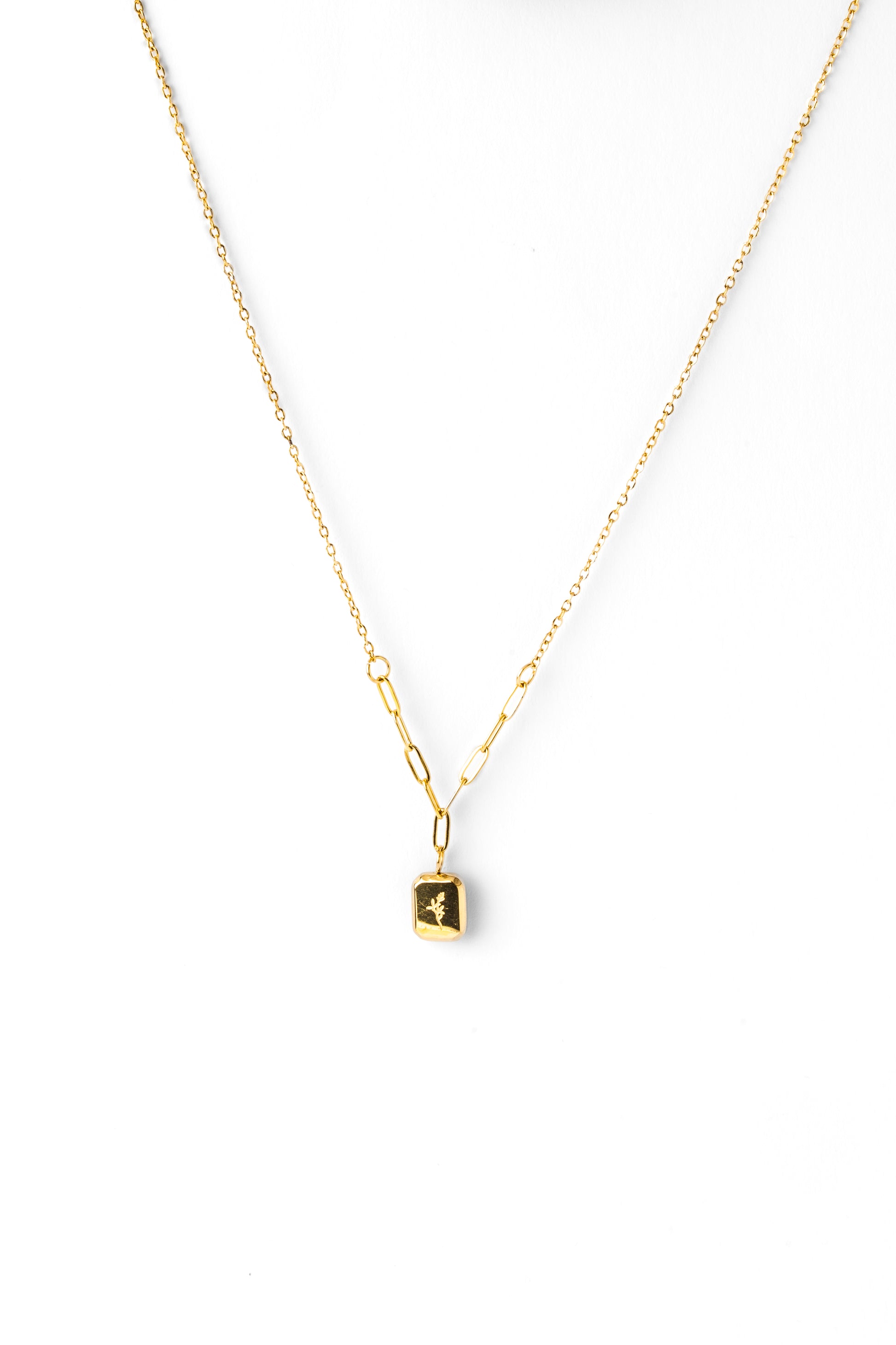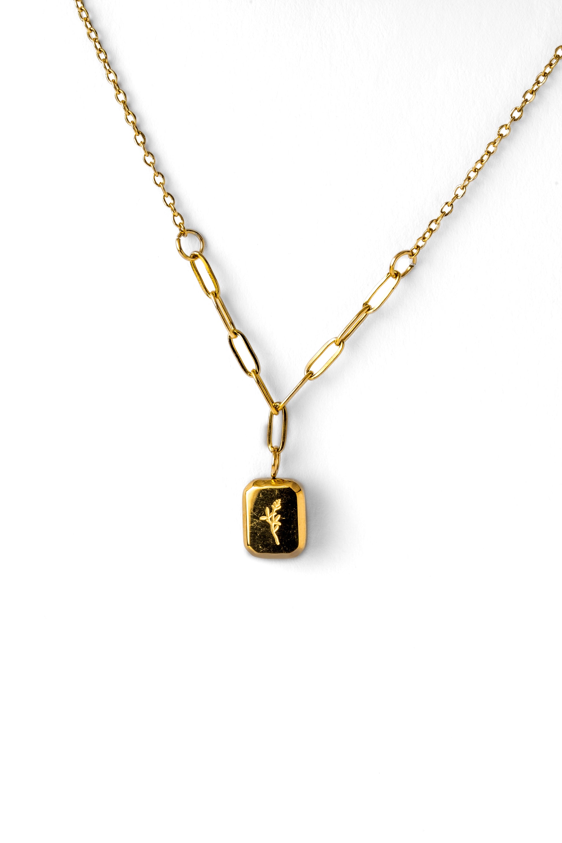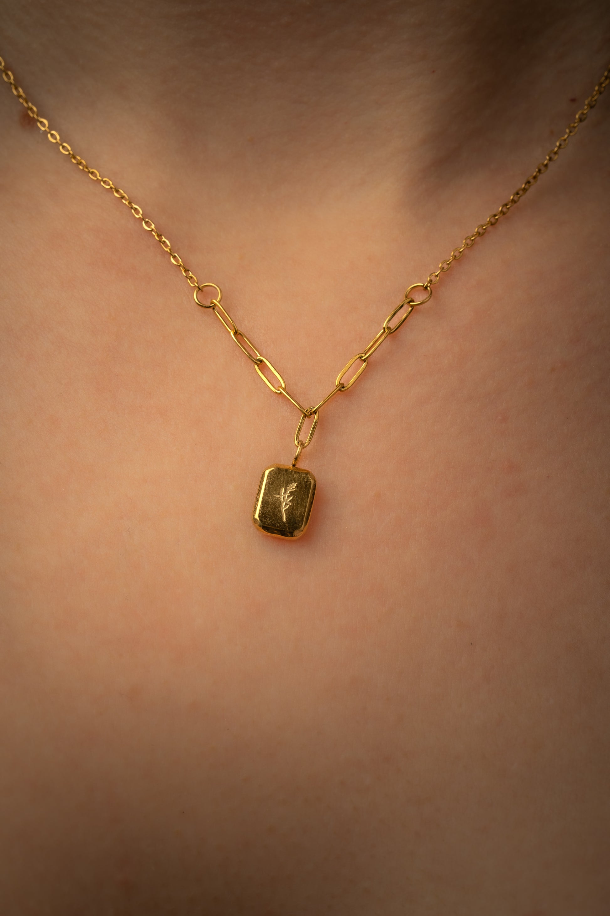 Colier placat cu aur de 18K cu lanț din zale alungite și pandantiv tip plăcuță gravată.