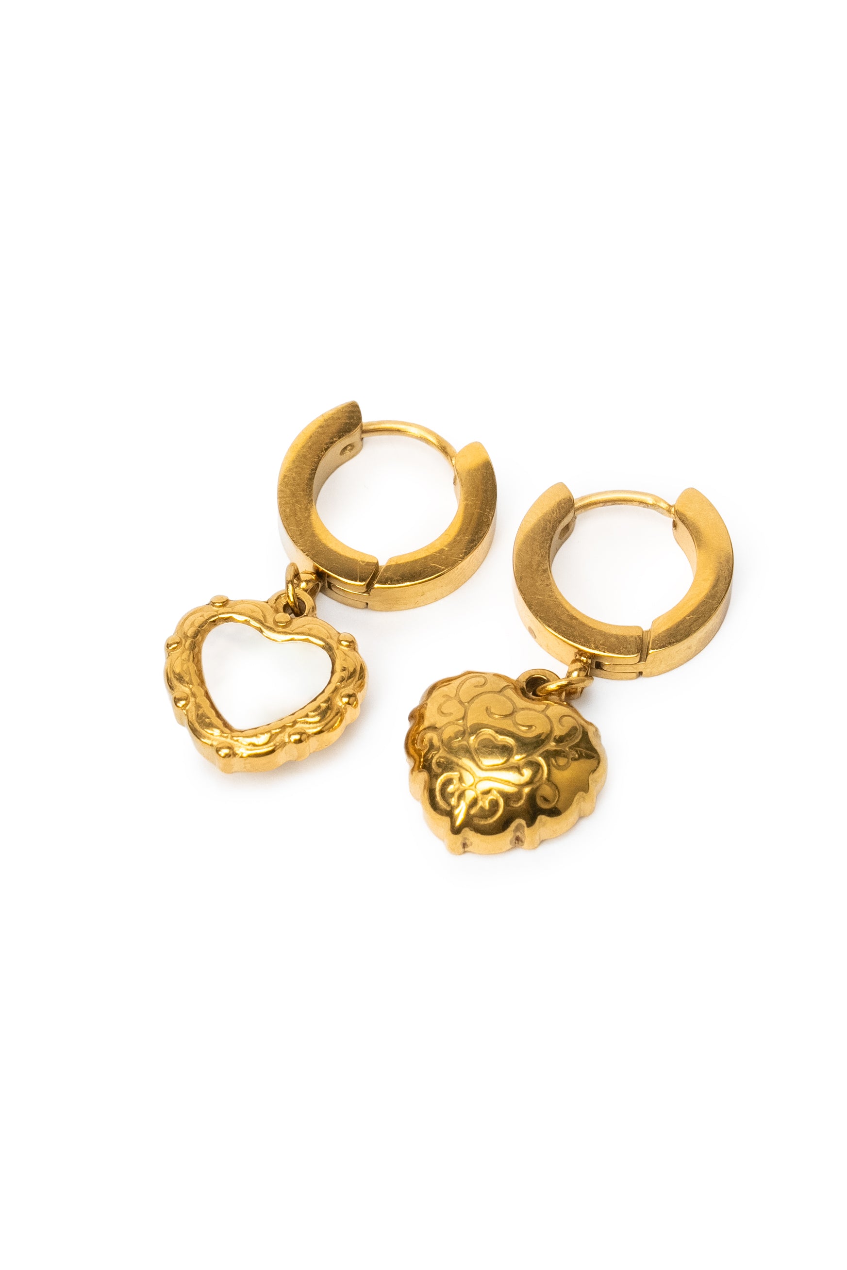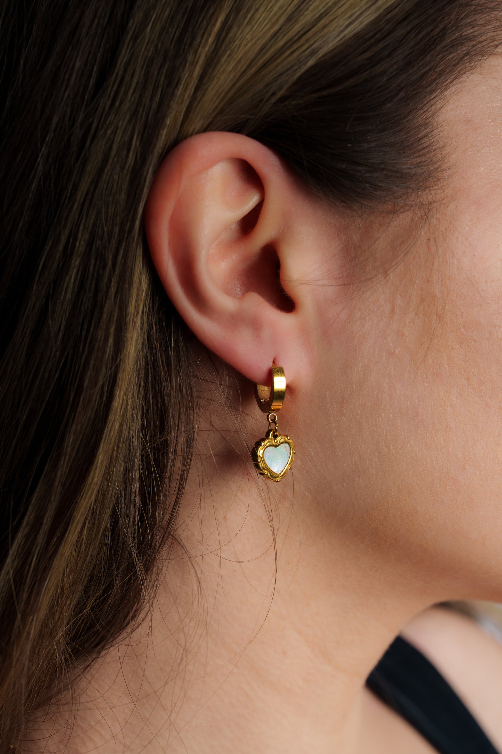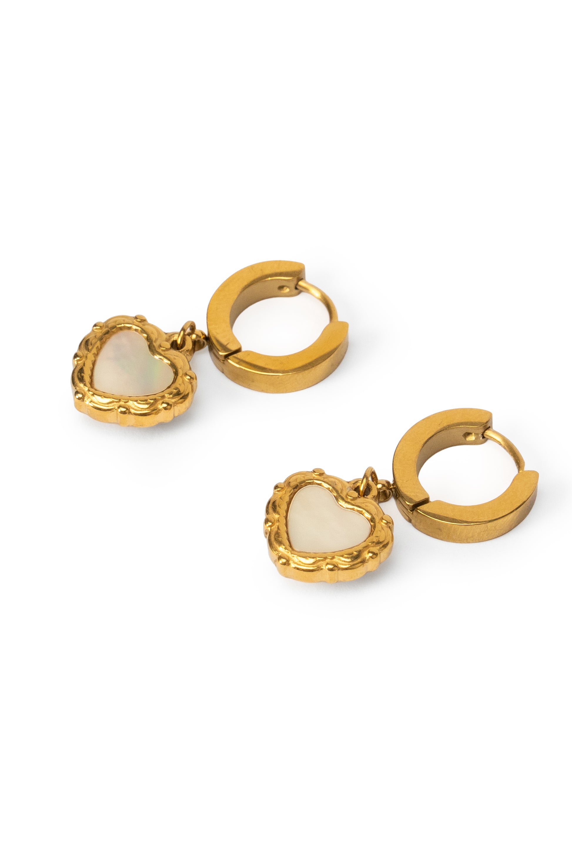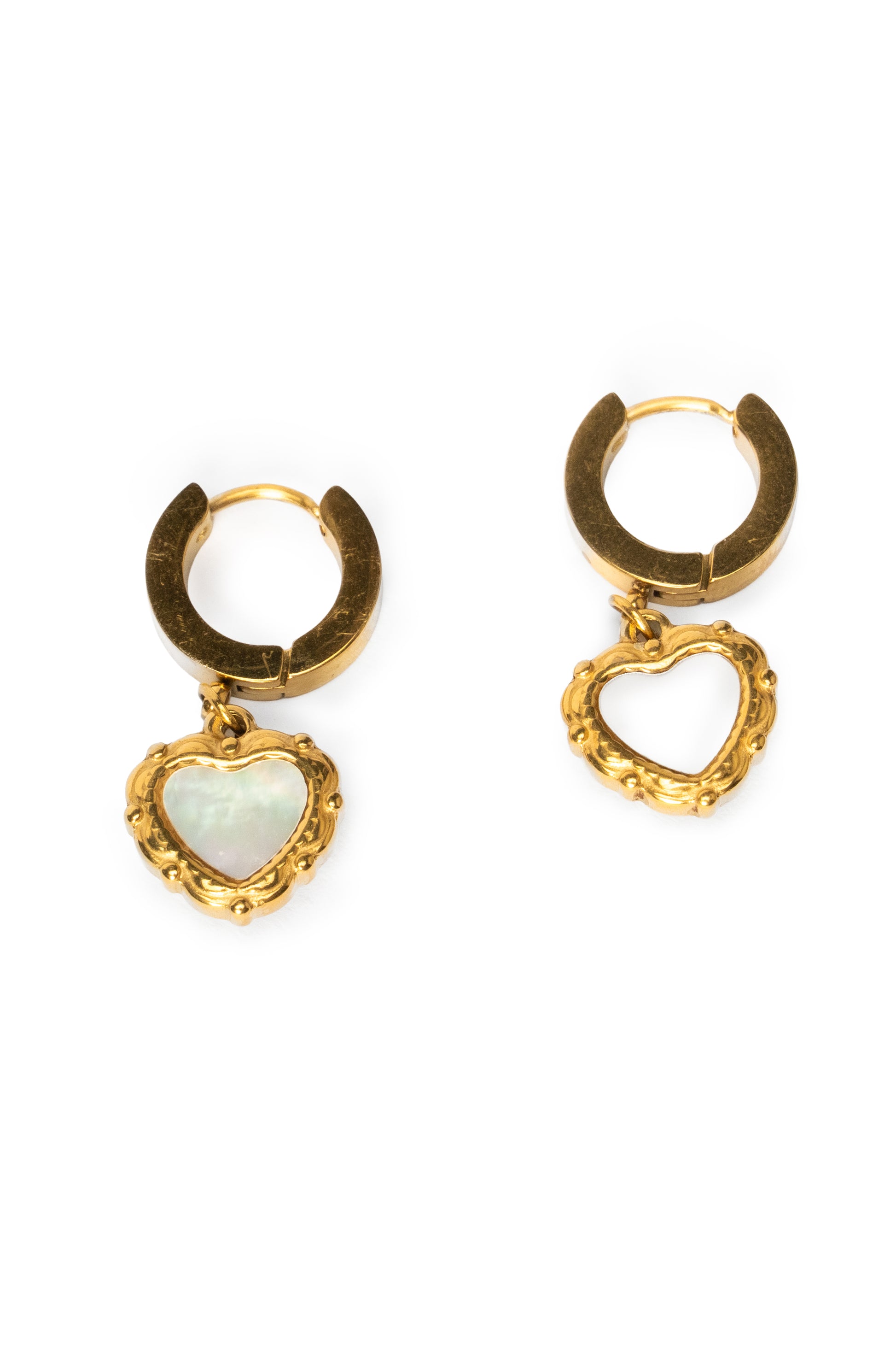 Cercei placați cu aur de 18K, cu inimioare sidefate și un design vintage cu detalii fine.