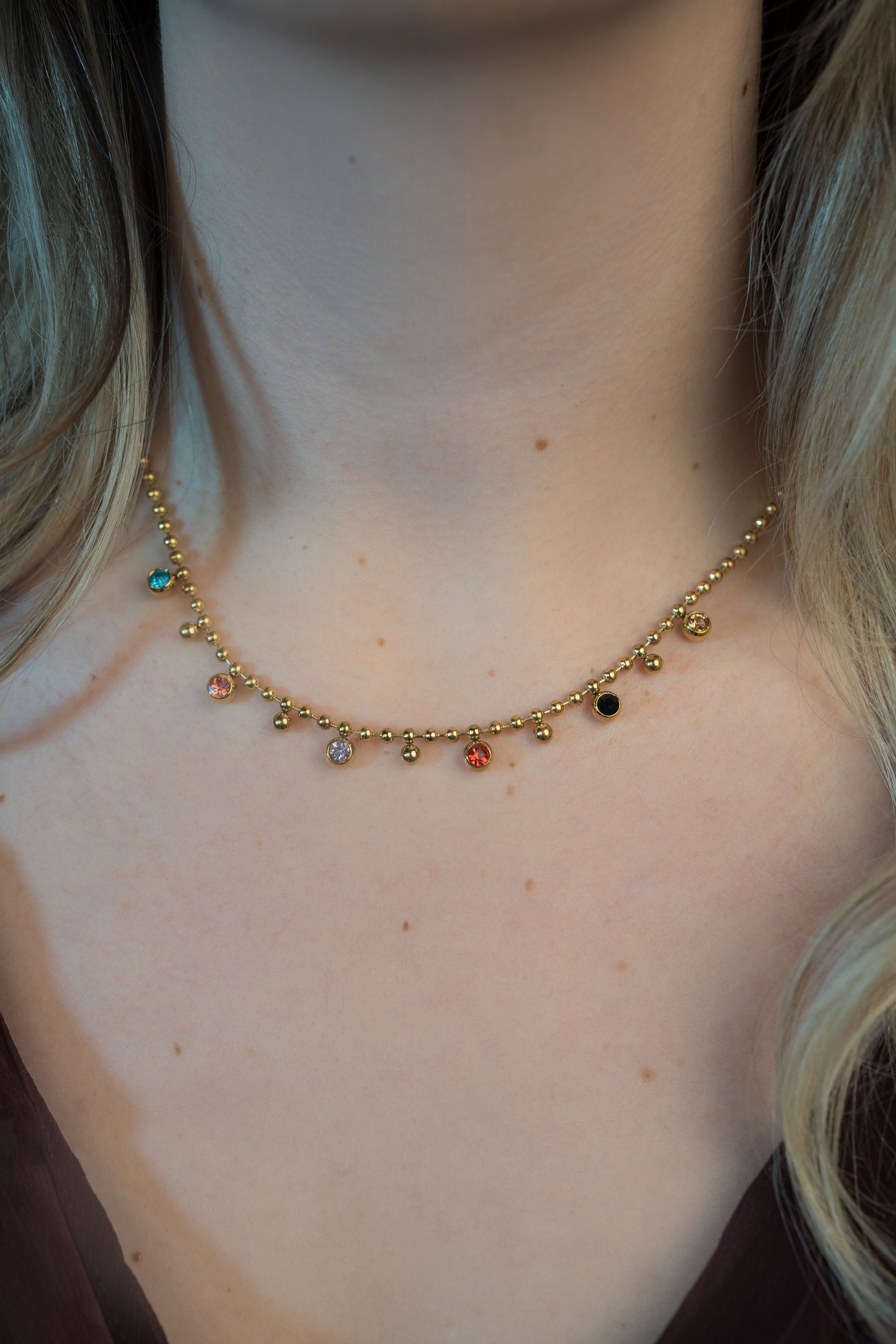 Un colier vibrant, jucăuș și plin de personalitate - este accesoriul perfect pentru femeile care adoră să-și exprime energia prin culoare. Lanțul este format din bile aurii placate cu aur de 18K, iar pandantivele mici cu cristale colorate adaugă acel „pop” vizual care transformă orice ținută.