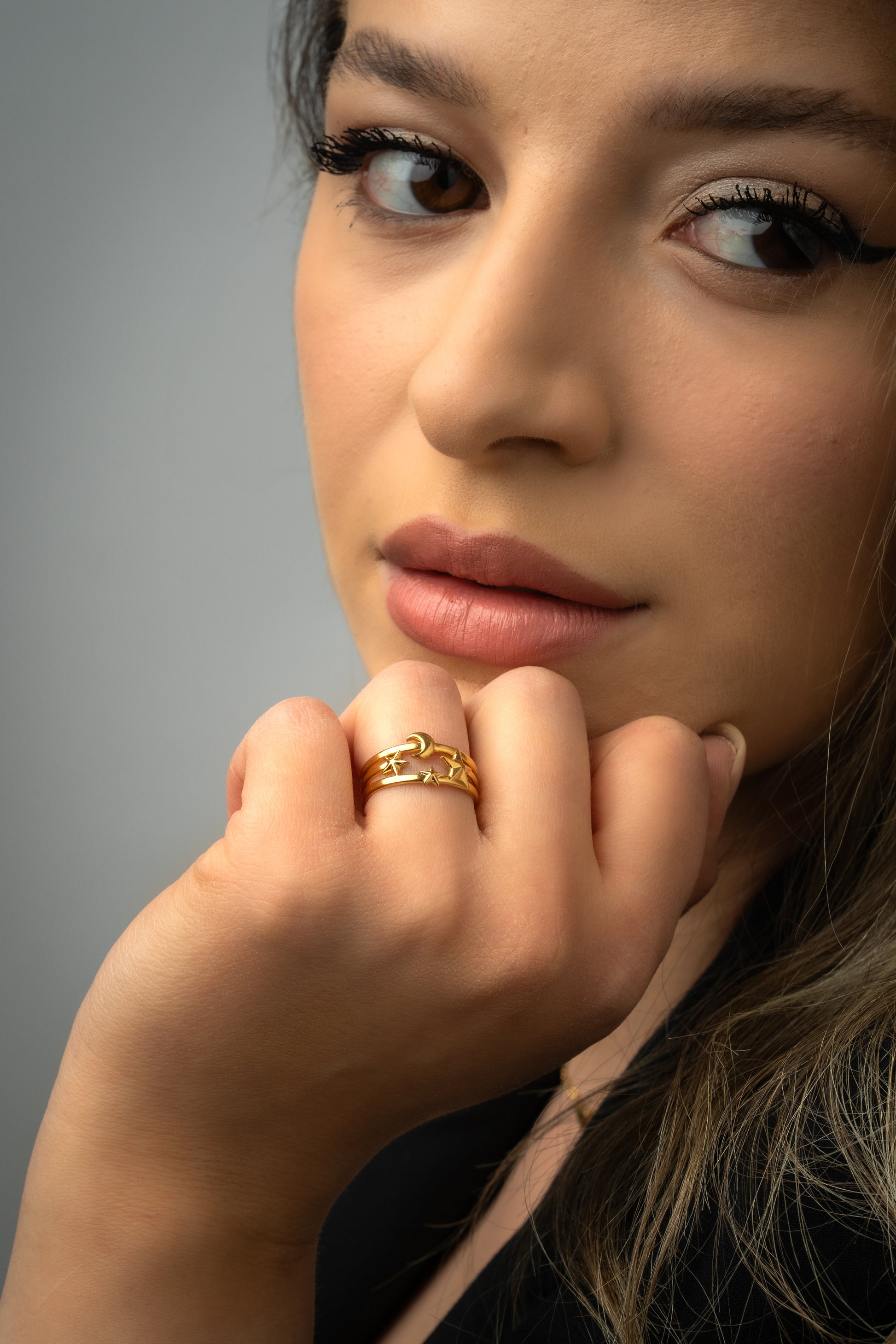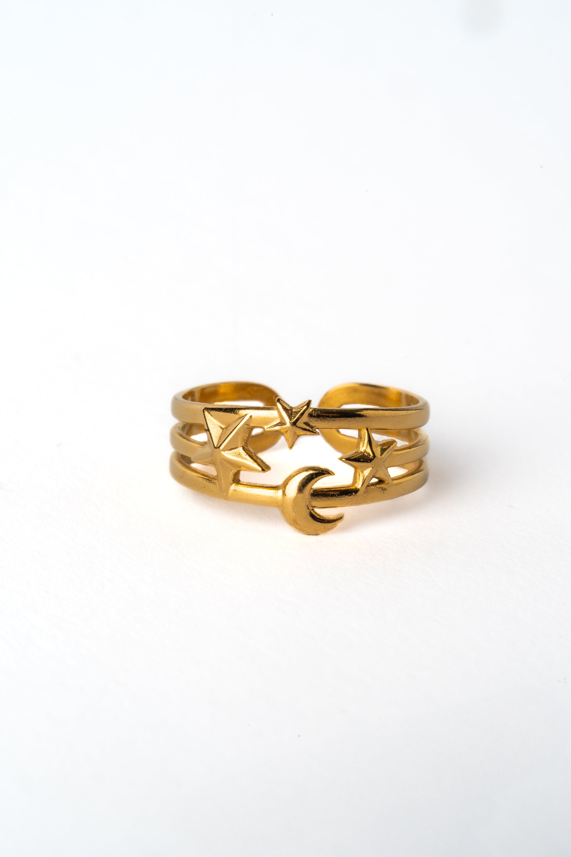 Inel ajustabil placat cu aur de 18K cu detalii sculptate în formă de lună și stele, design deschis.